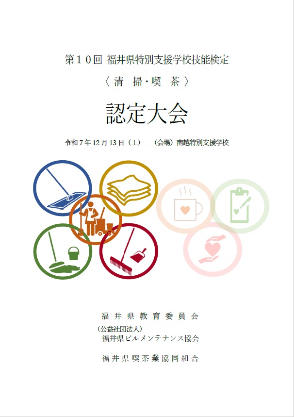 福井県内の特別支援学校より清掃部門26名の参加により開催され、当協会からは検定員4名が審査および会場設営撤去等の協力支援を行いました。